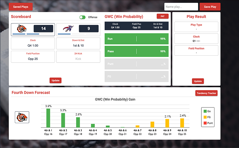 EdjFootball NFL is designed to harness the power of EdjSports proprietary simulation model, the first fully customizable simulation model in football. NFL coaches are able to input any game state which will then run through 100,000 game simulations and give recommendations on the best play calls to increase their teams win probability. The challenge was to build a product that is easy to use for football coaches and can communicate complicated statistical concepts in an easy actionable way. For the NFL version, historical data from the previous 20 years of play combined with the current makeup and performance of the teams, is automatically input into the app. This means, all the coach or assistant has to do is enter any gamestate, with any team, at any time to run the simulation and see the results.